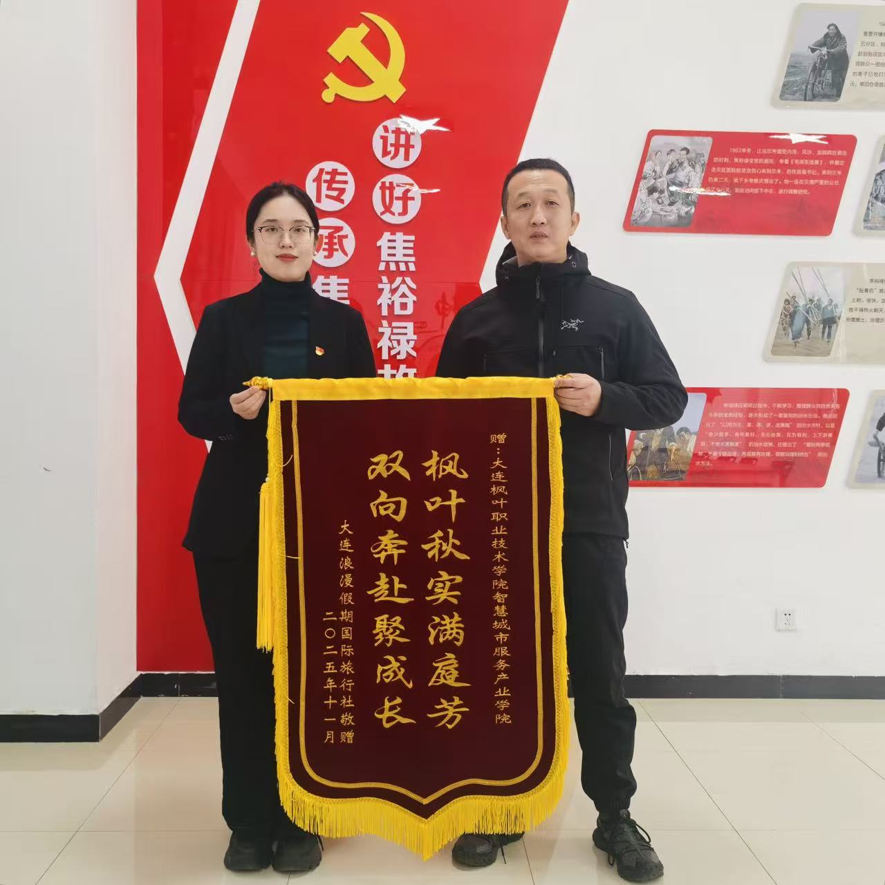 随后,曹经理代表浪漫假期国旅向我院赠送印有“枫叶秋实满庭芳,双向奔赴聚成长”的锦旗,以锦旗为证,见证双方合作的丰硕成果。双方还就未来合作达成一致,后续将进一步深化课程共建、实习实训、研学产品研发等领域协作,持续为旅游行业培育高素质应用型人才,推动校企合作迈向新高度。