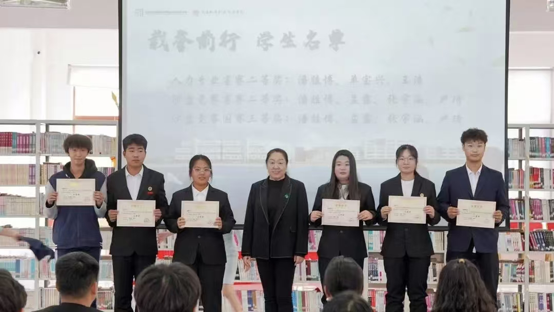 表彰环节,张冬冬副校长为获奖学生颁发证书,为教师授奖杯鲜花,肯定师生拼搏与协作精神,强调竞赛对职业素养提升的关键作用。指导教师宋艳、周岩分享备赛经验,提及跨专业组队价值及赛项与行业标准、职业证书的高度契合;学生代表潘胜博介绍社团培养体系,明确招募要求,邀约学子加入。