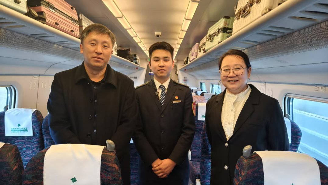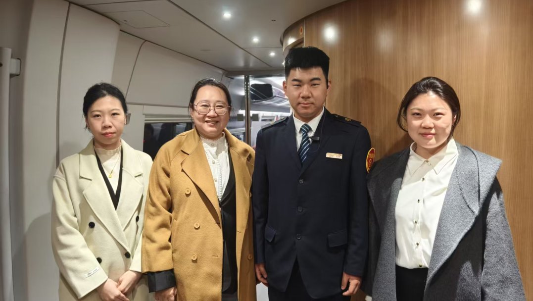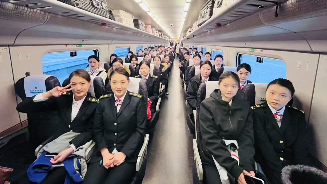 在列车行进途中,一个意外的惊喜让这次旅程更具意义。学生们发现,所在车厢的乘务员正是学院22 级高速铁路客运服务专业的杨泽昆,他目前已在铁路段岗位实习。当杨泽昆看到熟悉的老师以及满怀憧憬的学弟学妹时,脸上洋溢出自豪的笑容。他热情地向大家介绍了自己的工作日常和实习经验,鼓励学弟学妹们珍惜实习机会,努力提升自己。与此同时,学生们还惊喜地遇到了同样在工作的 22 级吴佳航同学。吴佳航同学在岗位上认真专注,看到母校师生,难掩激动,与大家交流工作中的成长与收获,他忙碌却坚定的身影,让学弟学妹们对未来实习充满期待。这次实习途中的相遇,不仅彰显了学院在人才培养方面与铁路局合作的显著成果,更为即将投身实习的学生们树立了榜样。杨泽昆的经历让学弟学妹们真切感受到,通过学院与铁路局搭建的实习平台,他们未来也能在自己的专业领域发光发热。