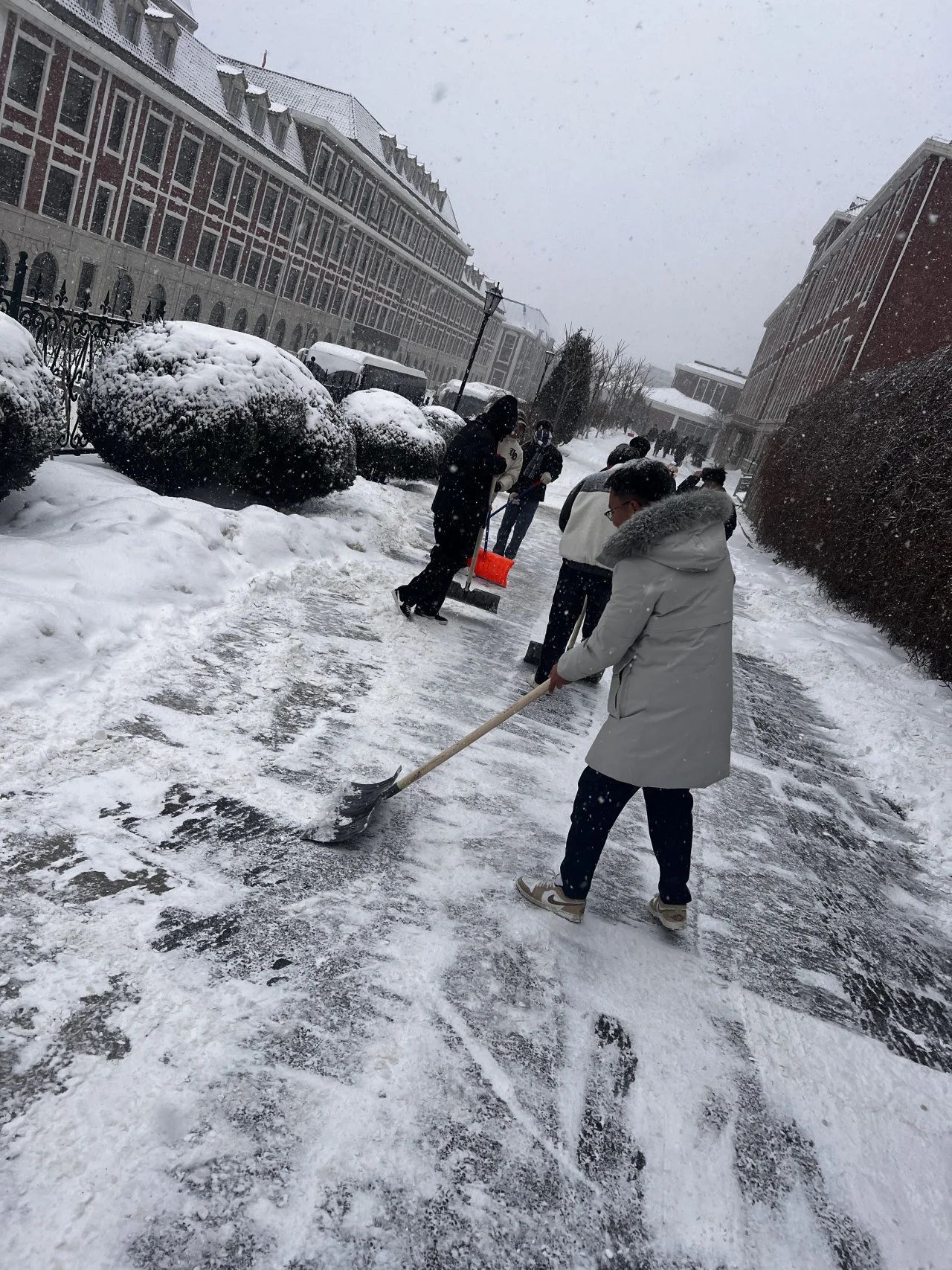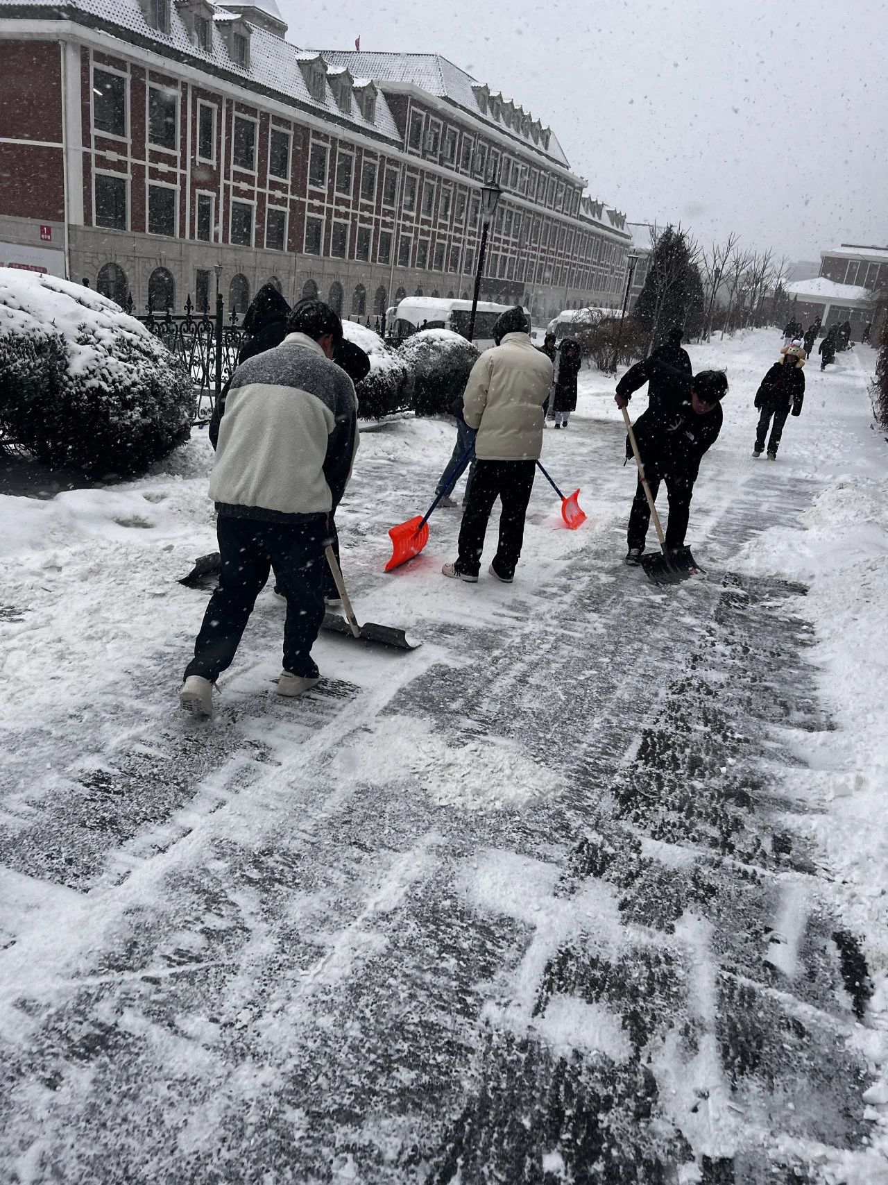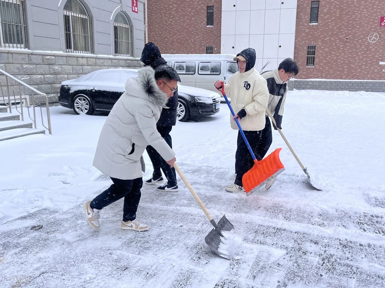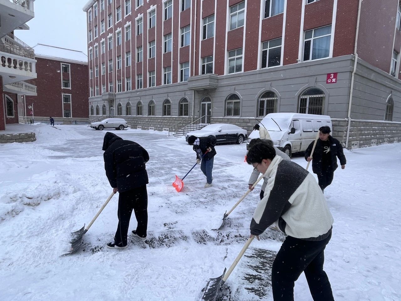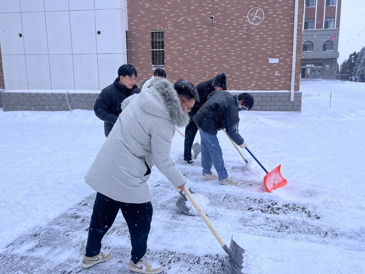 雪寒心热,力微心齐,师生志愿者们积极响应号召,发扬不怕苦不怕累的奉献精神,以雪为令,现身行动。他们用铁锹铲除厚重的积雪,分工明确、齐心协力使用各种工具轮番上阵,使三号教学楼前和五角楼附近的积雪得到了良好的清扫效果。师生们不惧严寒,奋力劳动,为大家的安全出行保驾护航,为学院工作的有序开展提供了良好保障。