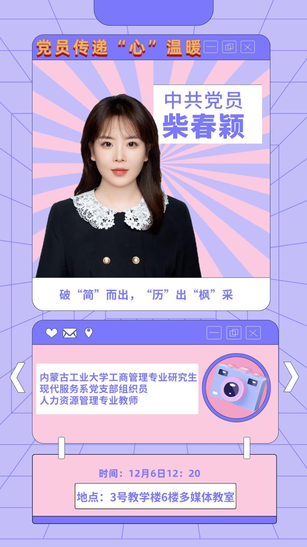 明天中午12:20分,党员教师柴春颖将在3号教学楼6楼多媒体教室进行以破“简”而出,“历”出“枫”采为主题的党课活动。欢迎大家准时参加,不见不散。
