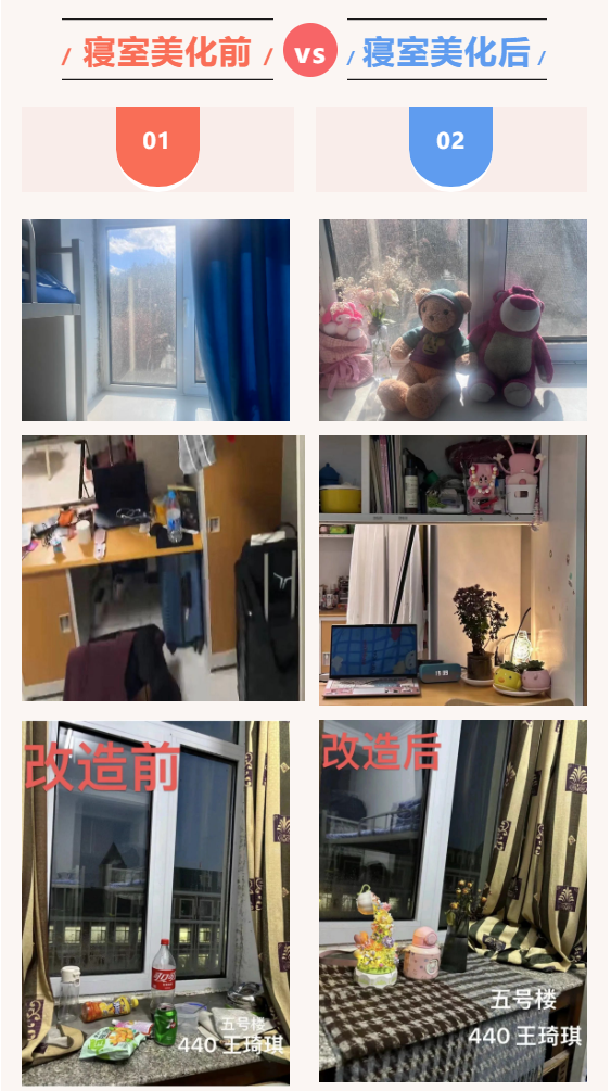 为激发广大学生对于环境美化的兴趣和能动性,加强寝室文化建设,提高学生的集体荣誉感和归属感,营造良好的学习和生活氛围,学院举办了寝室美化大赛。经过现代服务系主任-鲁广豪、学生管理干事-李家旭和各班辅导员的精心评选,筛选出了十七个在寝室美化大赛中脱颖而出的优秀寝室,下面,让我们一起欣赏各寝室的美化设计吧!