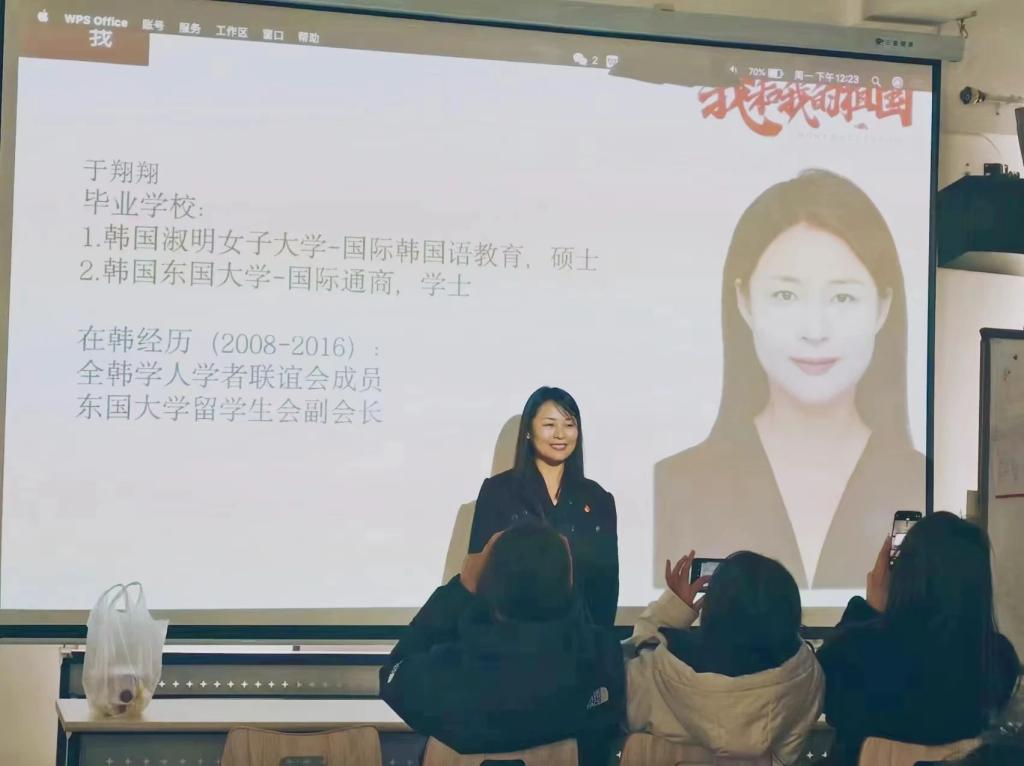 2023年11月27日,大连枫叶职业技术学院现代服务系党支部在3号教学楼617教室举办以“我和我的祖国”为主题的讲座。本次主讲人是党员教师于翔翔,老师分享了自己在韩留学经历,并结合自己多年的留学经验,给予同学们很多实用性的建议,并为同学们答疑解惑。接下来请跟着小编的步伐去看一看。