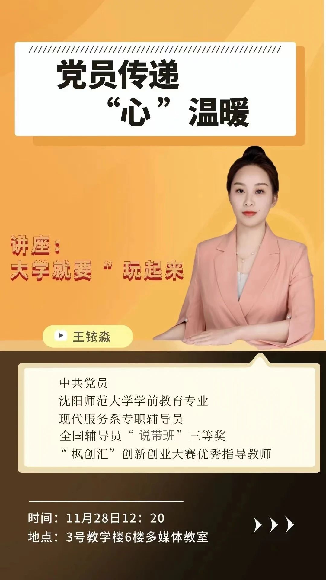 明天中午12:20分,党员教师王铱淼将在3号教学楼6楼多媒体教室举行大学就要“玩”起来为主题的讲座,欢迎大家准时参加,不见不散。