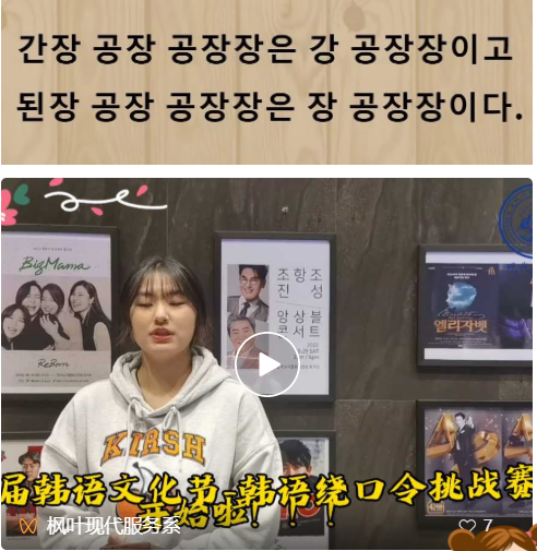 19级应用韩语1班都文丽在韩国发起首届韩国文化节——韩语绕口令挑战赛。
