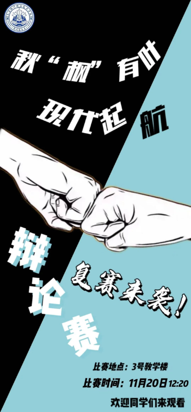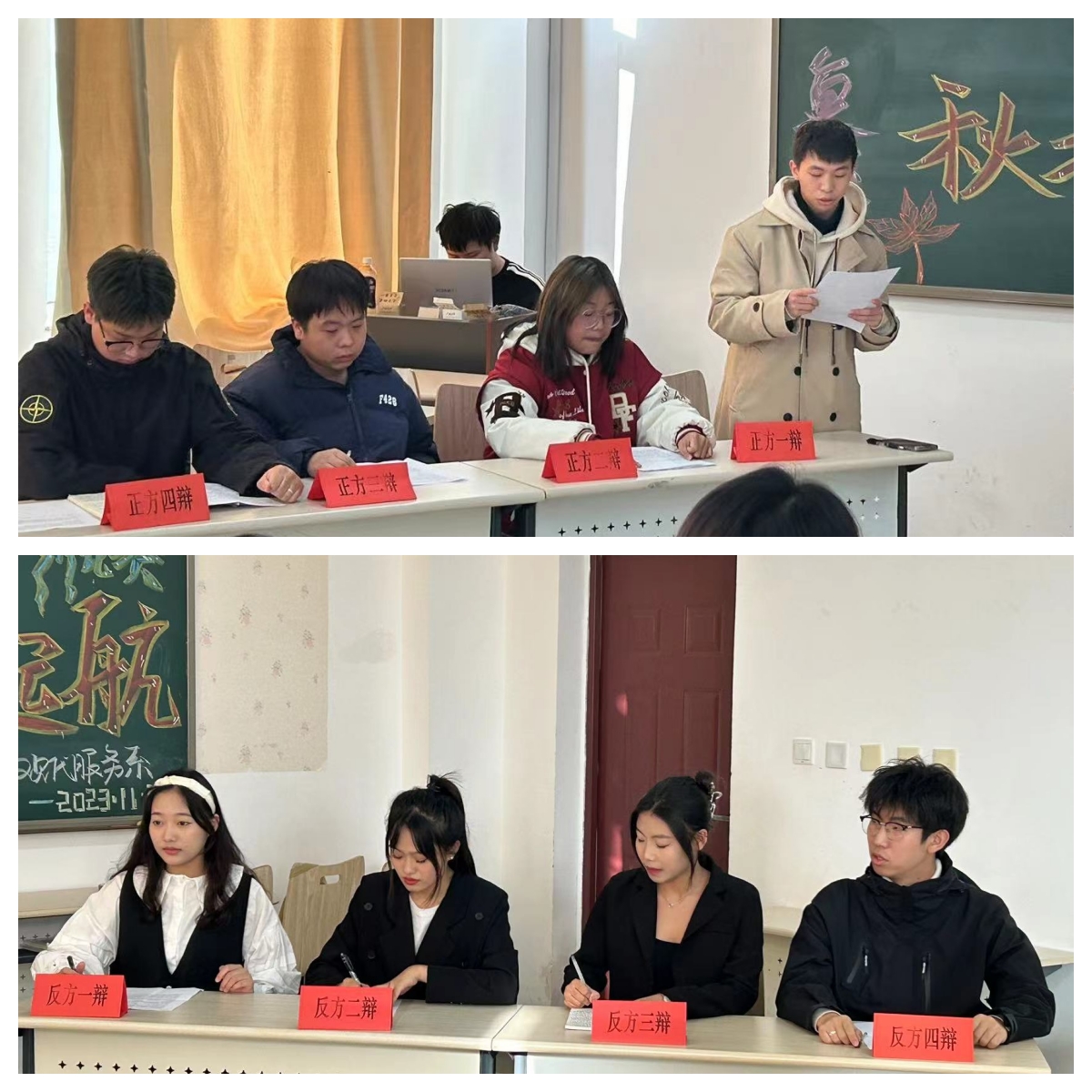为了活跃校园气氛,丰富课余生活,体现现代服务系学生风华正茂的精神状态。同时,也为了培养发掘辩论人才,提高现代服务系学子的语言组织表达能力和逻辑思维能力,培养团队合作精神,塑造有思想、有性格、有良好口才的当代大学生形象,激励学生勇于表现自我,发展自我,提升自我。现代服务系于2023年11月20日中午12点在3号教学楼411开展了秋“枫”有叶·现代起航辩论赛复赛。