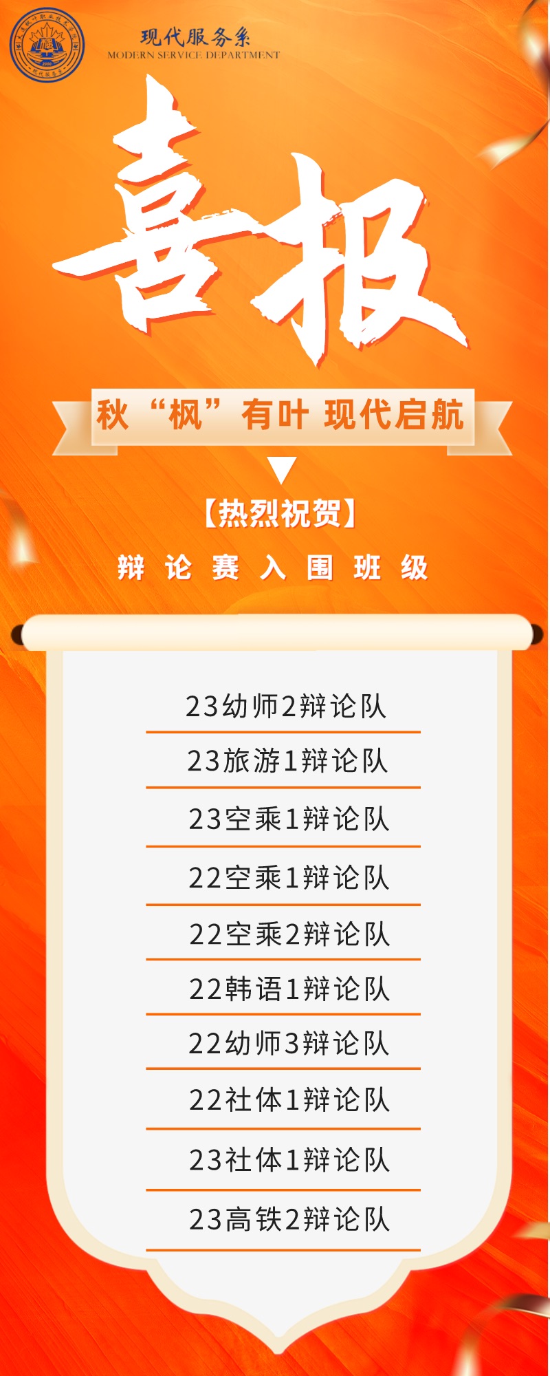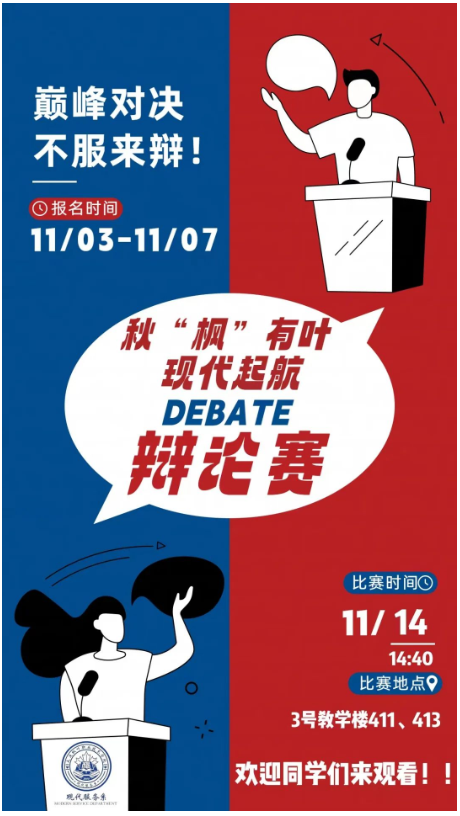语言魅力在当今社会的重要性日益凸显。为了培养同学们团队协作的能力与意识,提高同学们的逻辑思考和语言表达能力,丰富课余文化生活,11月14日14:40,现代服务系教学助理团组织开展了“秋“枫”有叶·现代起航”第一届辩论赛。