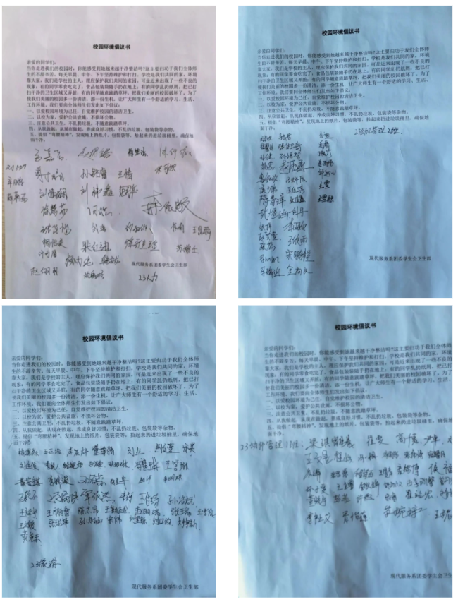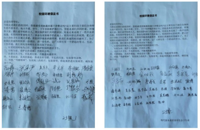 在听完宣讲后,同学们对班级卫生有了更深一成的了解,决心营造舒适、干净的学习环境,并改善班级卫生环境,纷纷在“校园环境倡议书”上签上自己的名字。