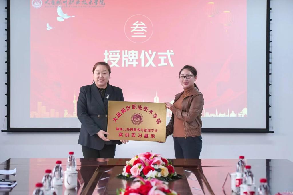 双方本着平等互助、携手共进的原则,充分发挥各自的优势,加强“校·企”合作与交流。大连枫叶职业技术学院院长助理张冬冬授予壹迪(大连)托育有限公司为大连枫叶婴幼儿托育服务与管理专业实训实习基地。
