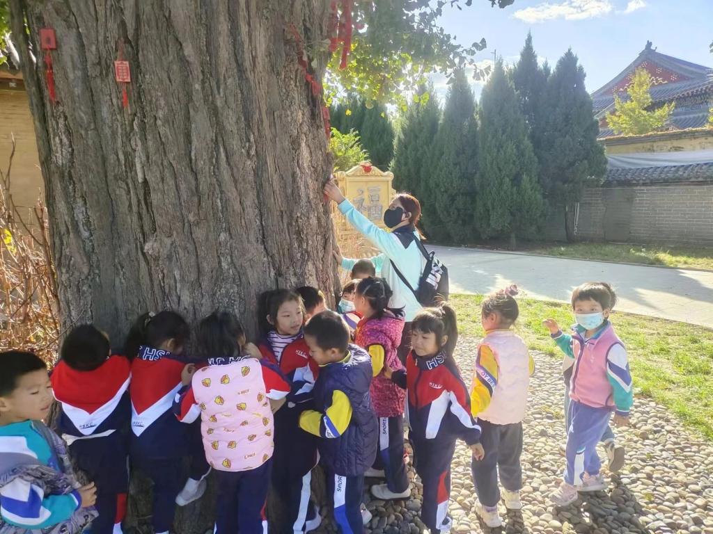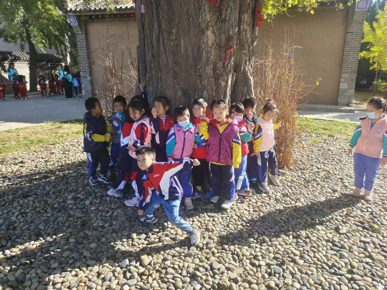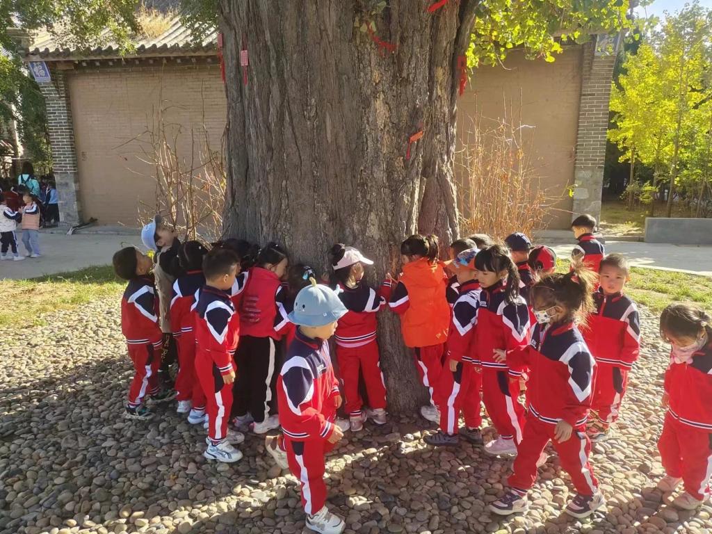 看啊!闫主任正在绘声绘色地给小朋友们讲述关于千年银杏树的故事。小朋友们听的可认真了。落满银杏叶的屋檐滴下,滴穿了千百年的时光,诉说着千百年的沧桑。听完闫主任的故事,千年银杏树在小朋友们的心里的神秘感更浓了,在这神秘感的驱使下,小朋友们纷纷上前抚摸这千年银杏树,来感受它悠久的历史。