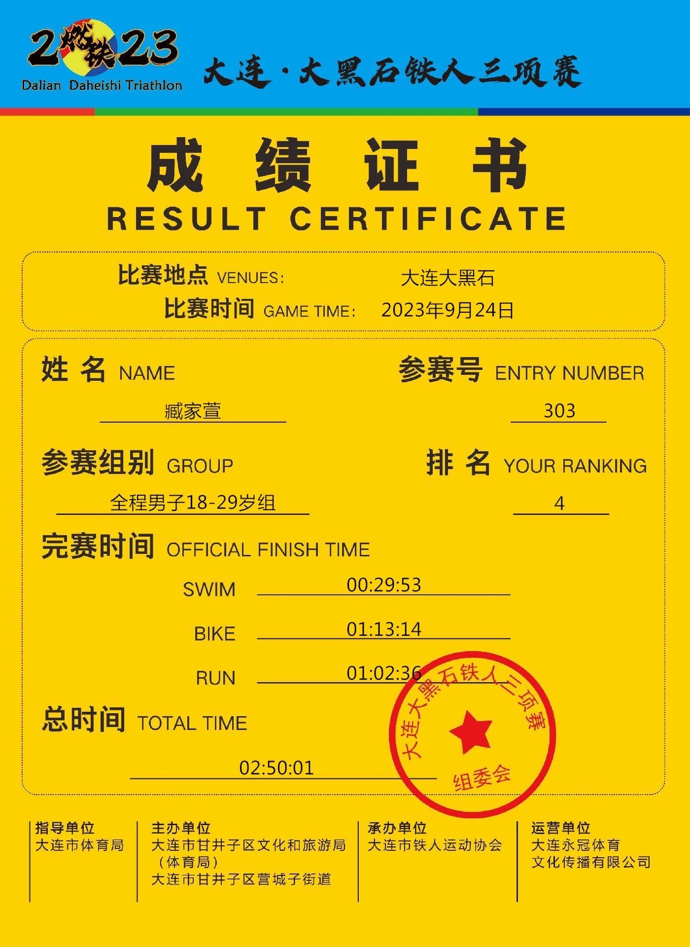 大连大黑石铁人三项赛18到29岁组第四名