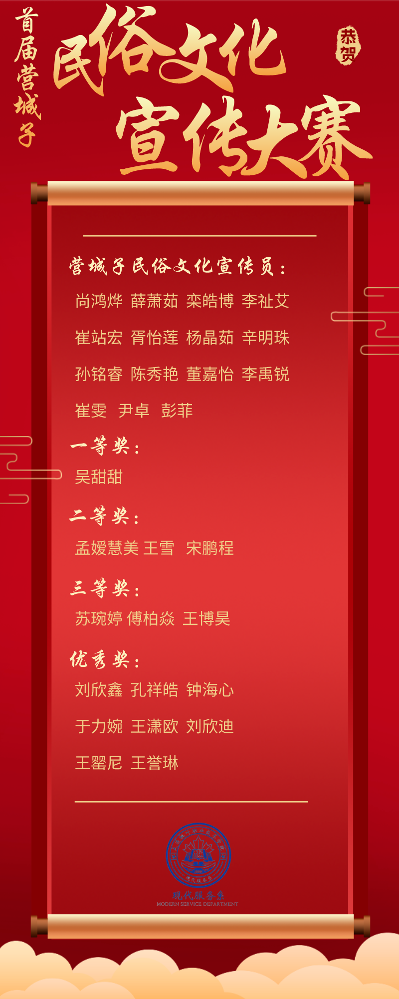 通过本次选拔赛,现代服务系23级学生用独特的讲解方式和演讲效果,获得营城子民俗文化领导的认可并得到了相应的奖项。