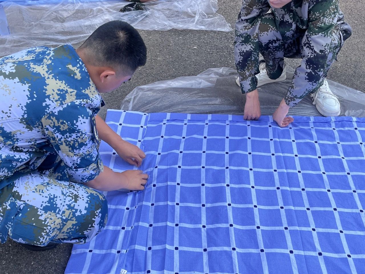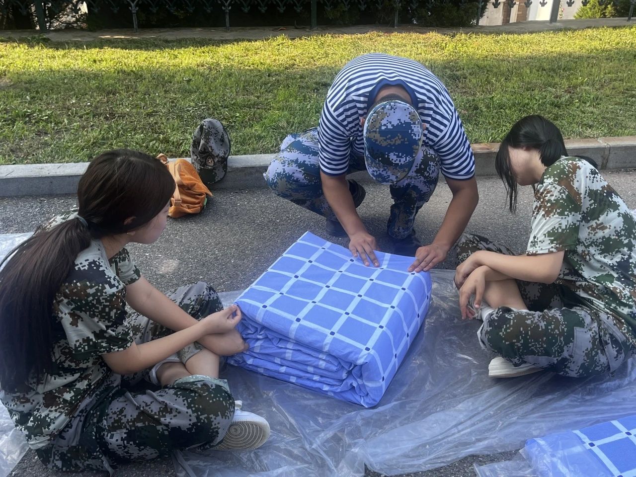 军训场上,教官们耐心指导同学们叠“豆腐块”,折叠压实,捏出被角,并亲自做示范来帮助大家,同学们认真聆听,积极学习。