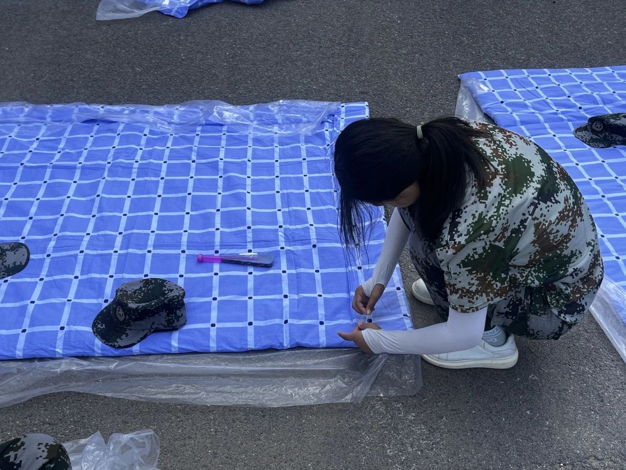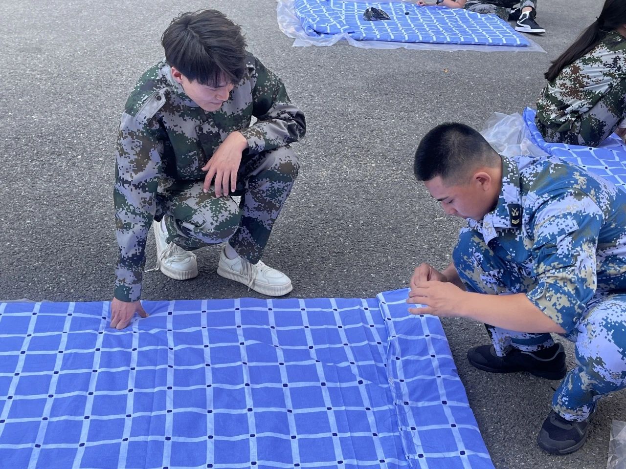 教官们向同学们讲解叠军被的要领,并细心指导,亲自为同学们做示范,同学们认真听讲,将“叠、压、捋”步骤牢牢记下。教官们还对宿舍物品的摆放、宿舍卫生、床铺整理的标准提出了明确的要求。整理过程中,同学们相互交流、总结经验,并纷纷表示会严格要求自己,一定达到教官提出的标准。