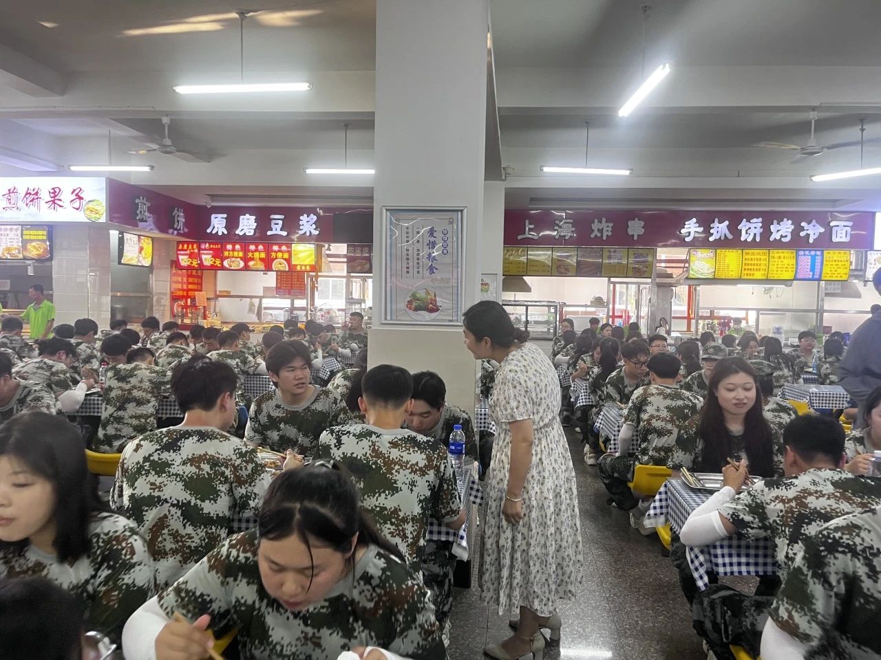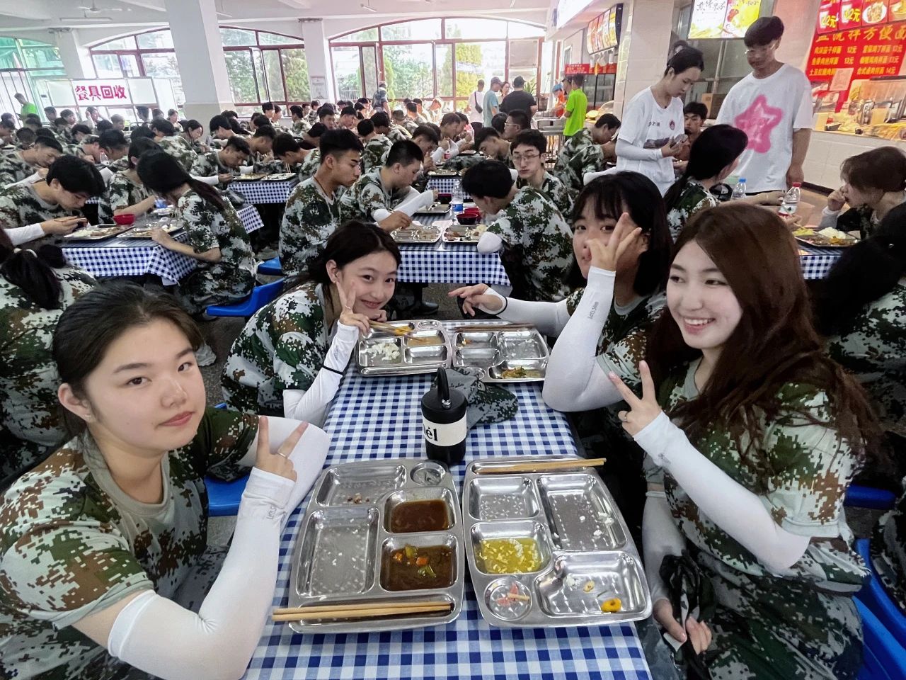 经过一系列高强度训练后的同学们,同学们正处于又累又饿的状态,恨不得马上狼吞虎咽一番。但是,作为军训就应该严格按照部队的标准,包括用餐也不例外。同学们依旧做到了有序排队、有序就餐、有序倒餐盘。