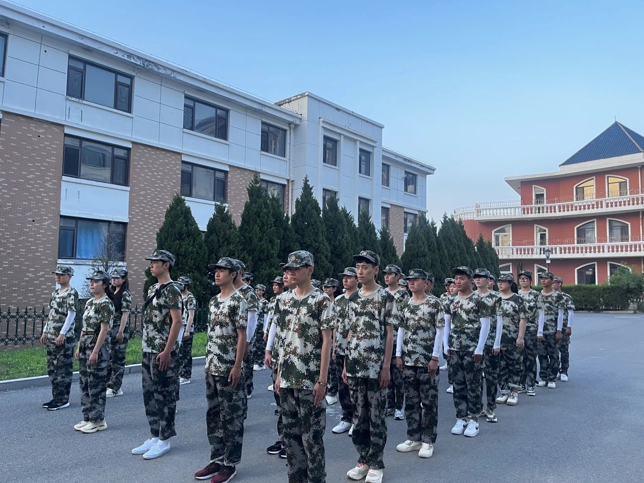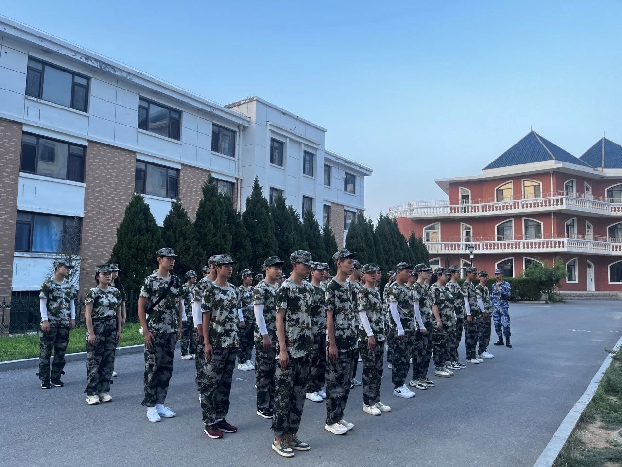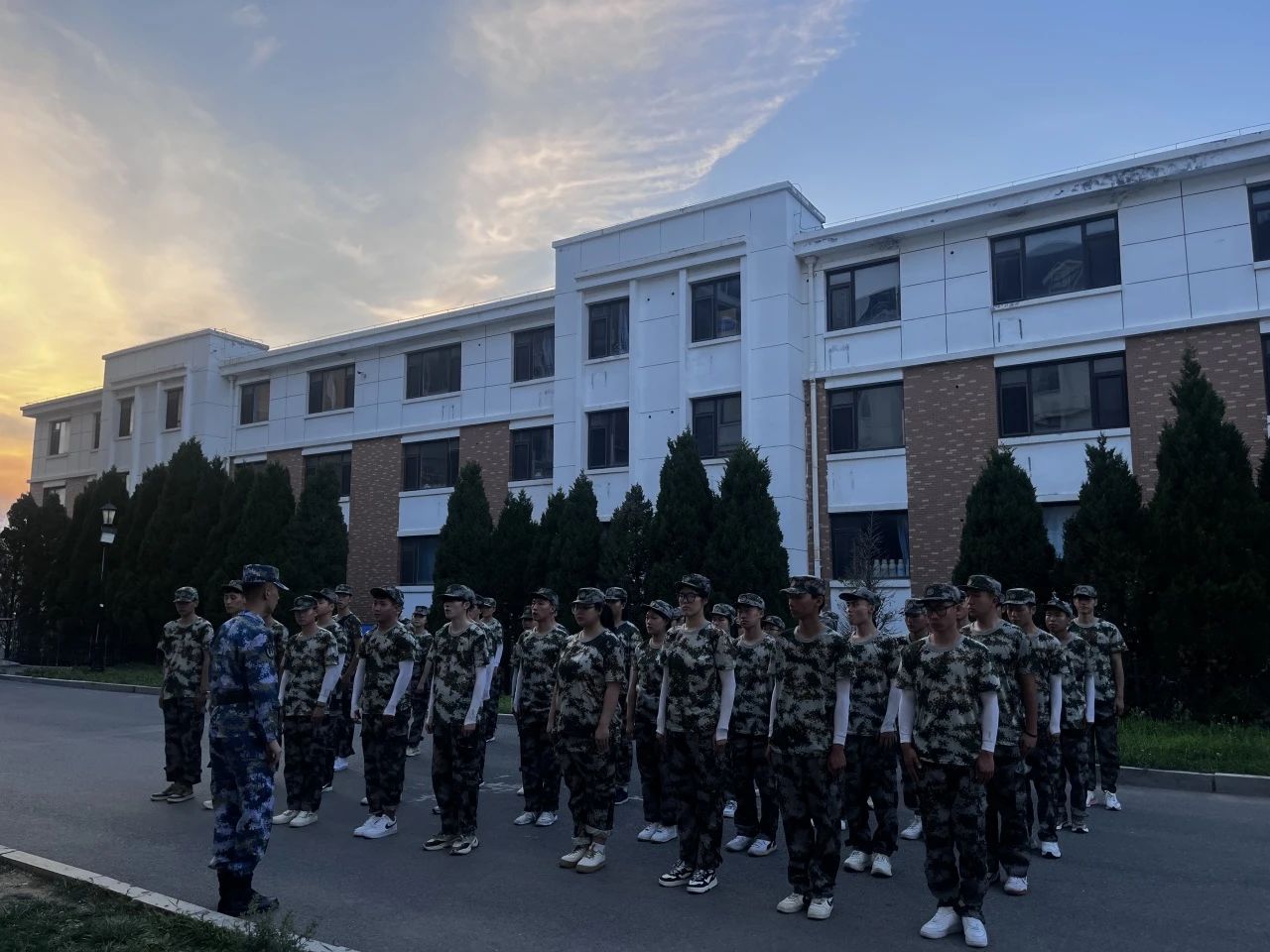 晚上6:30分,同学们在训练场集合。夏日的夕阳渐渐西沉,训练场上行军不止,夕阳的微光中,同学们眼神坚定地注视着前方,踏着稳健的步伐,保持着挺拔的姿态。他们的汗水如同夕阳下的珍珠,闪耀着勇往直前的信念。