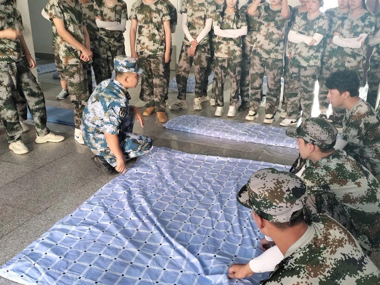 下午3时,助理辅导员及教官带领新生们来到3号教学楼前,教其学习内务整理。教官为同学们耐心的讲解叠被技巧,同学们仔细聆听,并认真学习如何叠军被。
