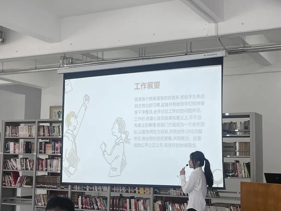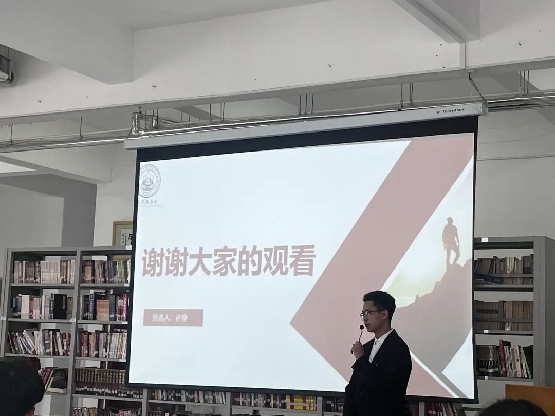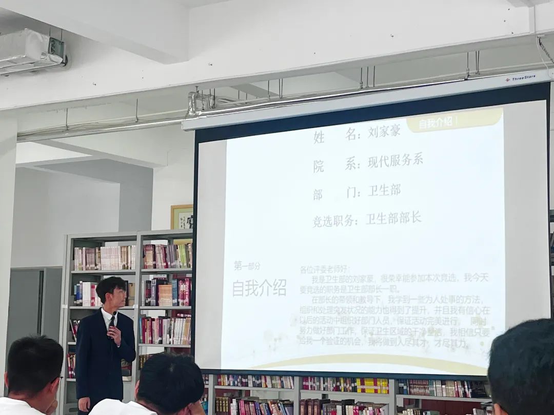 本次竞选分为个人陈述与现场答辩两个环节。各竞聘者按顺序发表竞选演讲。在演讲过程中,竞选者们信心满满,每位候选人皆以积极向上、言出必行的态度表明自己为现代服务系服务的工作决心,用过去一年里的真功实绩来展现自己勤实肯干的竞选优势,他们条理清晰地阐述了对部门工作的看法和未来规划,展现了积极进取的青春风采。评委老师与在座学生会代表认真倾听并记录、对各位候选人的表现进行了公正评判。