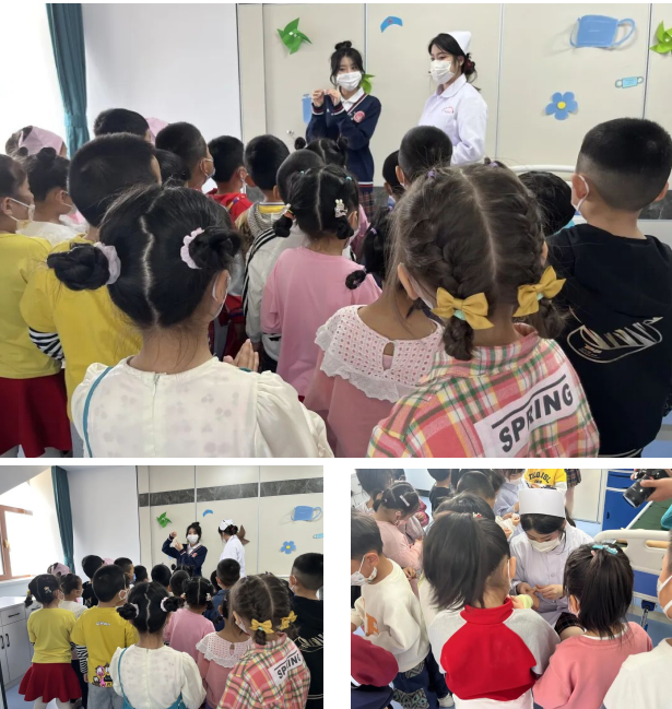 护士小姐姐们,正在给小朋友介绍创可贴的使用方法。快快举起你们的小手、我看看贴好了嘛?