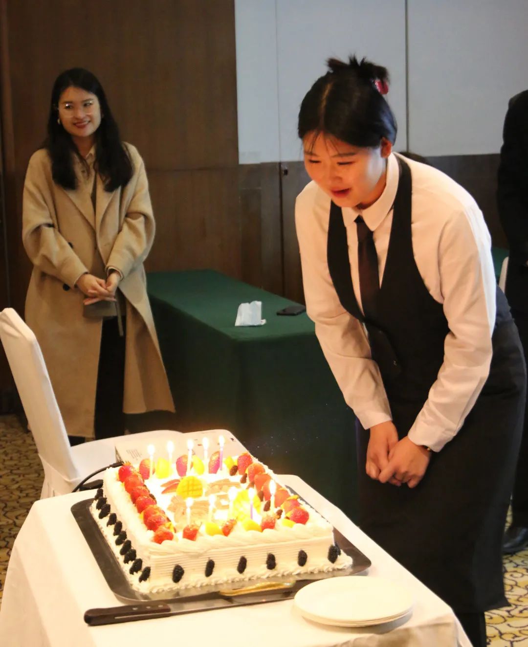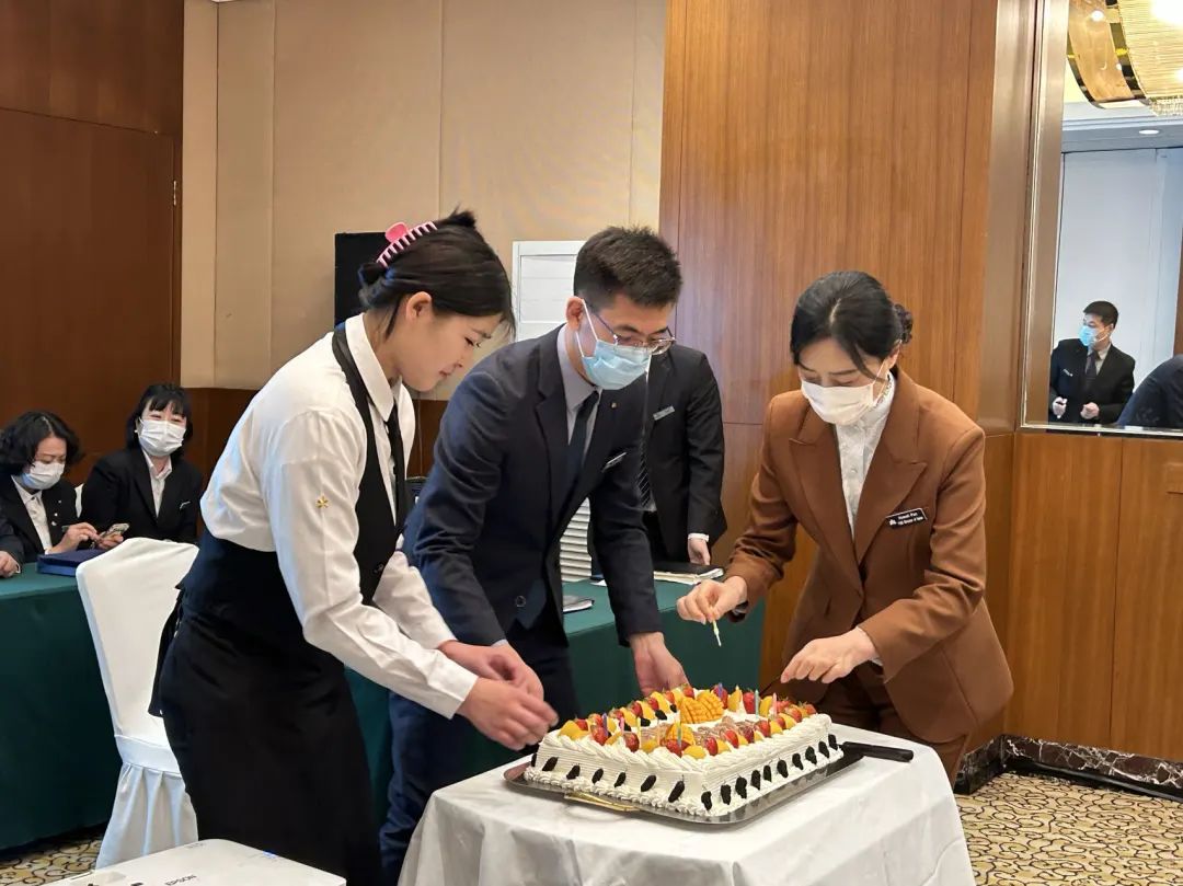 在大家都聚精会神学习相关部门工作流程以及方法时,日航饭店王经理出乎意料的关闭灯光唱响生日歌曲祝福今日寿星。