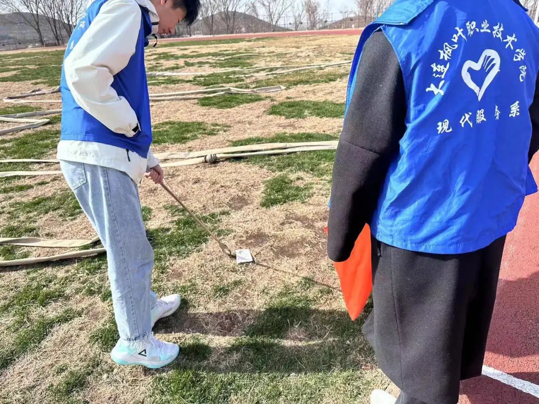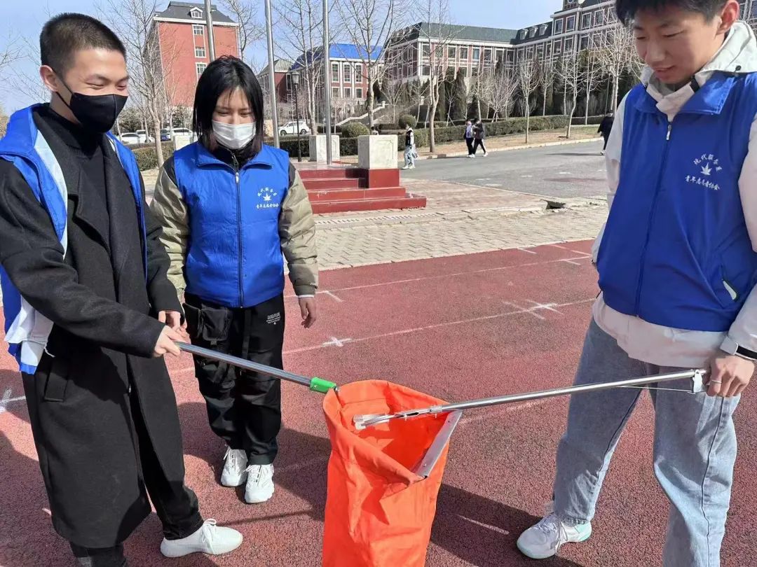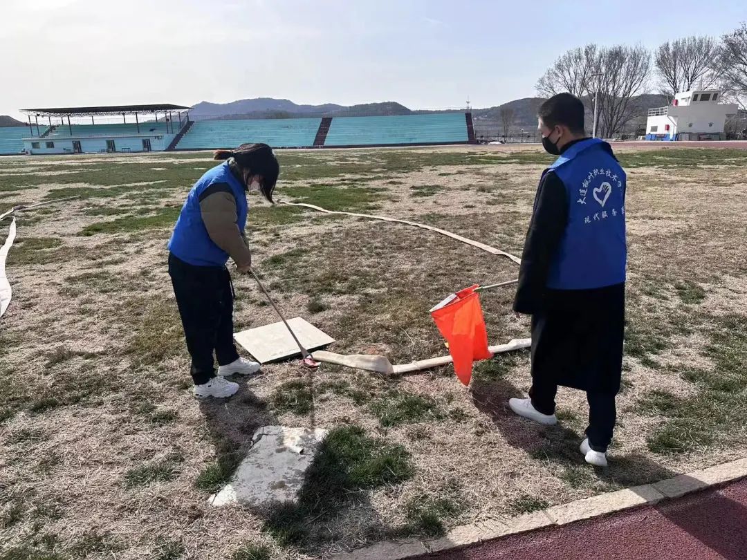 随后,在老师的带领下,现代服务系志愿青协会员们带上劳动工具来到了操场周边进行垃圾清扫。
