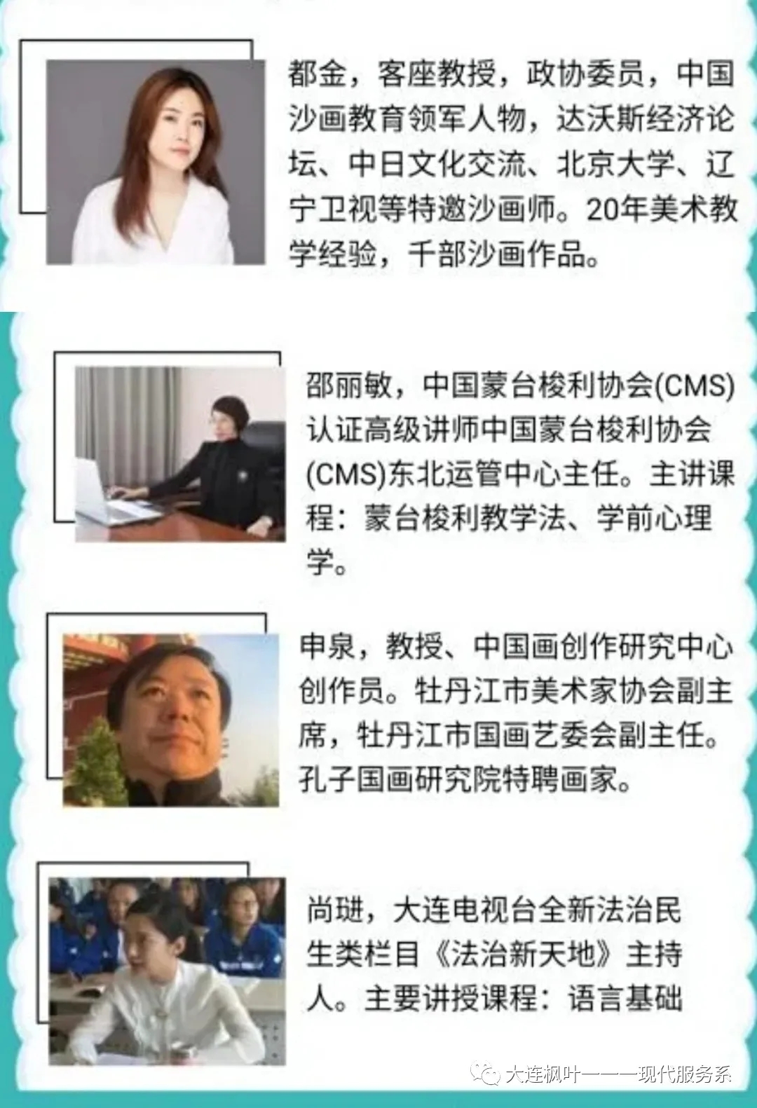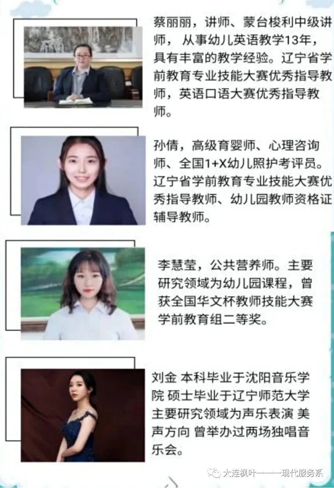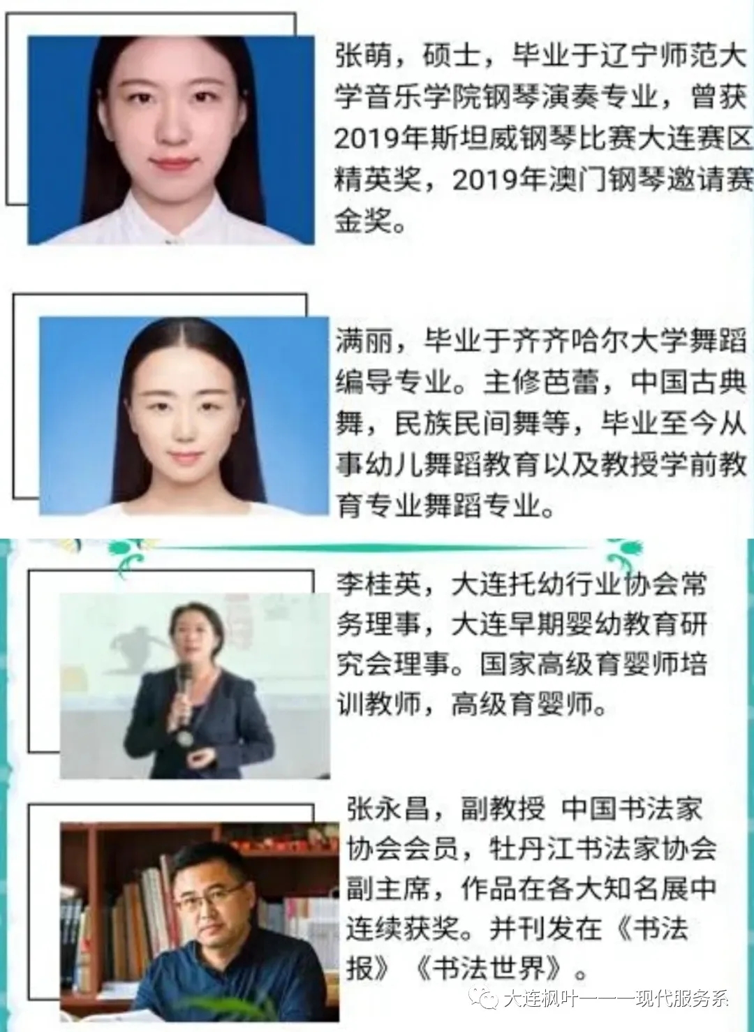 组建专兼职专家型团队,确保学生掌握最前沿、最先进、最实用的学前教育理论和实践技能。聘请幼教专家大连托幼协会理事李桂英教授、中国蒙台梭利协会东北运管主任邵丽敏、大连电视台主持人何子健、校企联盟中的幼儿园一线园长及骨干教师为学生授课、指导,结合就业岗位有针对性提升专业技能。
