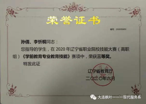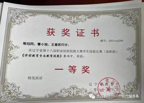 2021年在辽宁省学前教育专业技能大赛中荣获一等奖和三等奖。