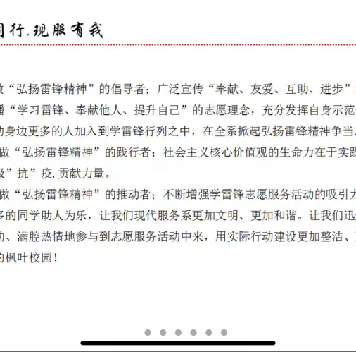 闫博书记结合“雷锋学习月”内容,倡导入党积极分子们学习雷锋精神,将雷锋精神应用到现实,争做“弘扬雷锋精神”的倡导者、争做“弘扬雷锋精神”的践行者、争做“弘扬雷锋精神”的推动者。使入党积极分子们可以做到积极主动、满腔热情地参与到志愿服务活动中来,用实际行动建设更加整洁、更加文明、更加美丽的枫叶校园!