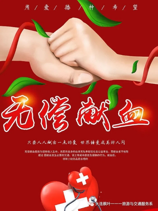 捐献可以再生的血液,挽救不可重来的生命,请同学们积极加入无偿献血的队伍中来,让希望在我们的爱心中延续,用实际行动,告诉祖国,她的小花朵长大了,可以帮忙遮风挡雨了!
