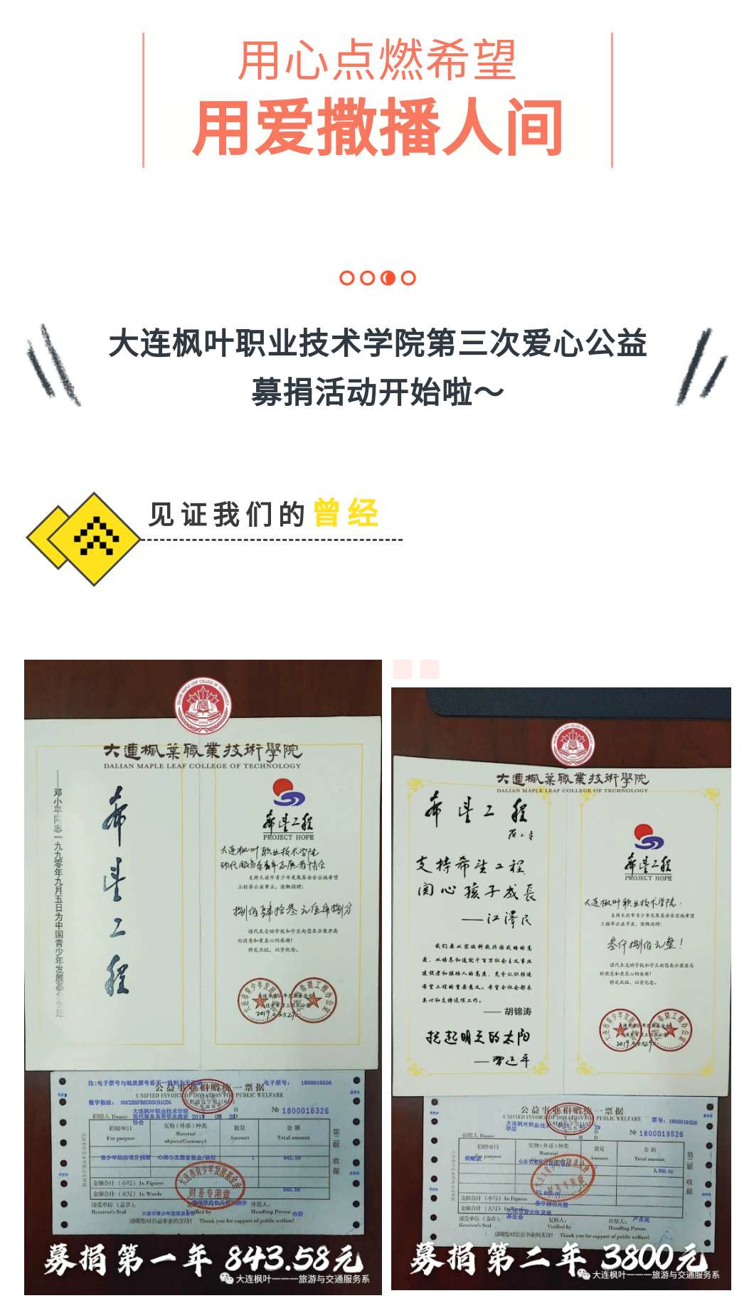 用心点燃希望、用爱撒播人间。大连枫叶职业技术学院第三次爱心公益募捐活动开始啦!见证我们的曾经,你帮,我帮,大家帮。
