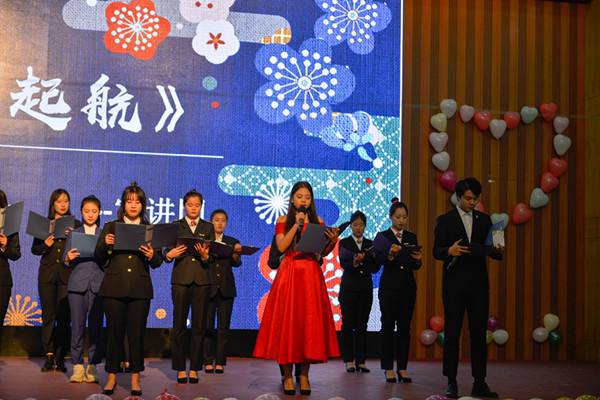 本次活动以班级PK赛形式展开,以社会实践为主题,通过现场即兴班级团队赛考查服务人沟通、聆听、模仿、合作、竞争能力。晚会以19级各班级助导制服走秀开场,活力四射,赢得了热烈的掌声。一曲高昂的歌曲《我相信》结束之后,正式开始了助导辅导员为代表的班级pk赛。助导技能大赛,屏幕现场滚动各班同学照片,助导进行信息介绍,考查助导对班级同学的熟悉和了解程度。两轮激烈的比拼之后19级韩语班级助力辅导员获得最强助导荣誉称号。学生会宣讲团带来诗朗诵《起航》,为19级同学们送上了诚挚的祝福。纪检部精心录制了视频,通过视频现场进行行为举止挑错,视频录制取材校园学习、生活,生动真实,学生们加强了违纪行为的认识,深深铭记实践期间遵守规章制度,法律法规。现场团队活动以感恩为主题,各班级同学为后勤、保卫和舍务工作人员送去祝福。卫生部带来收纳整理比拼,号召全体同学实践中注重保护环境,保证宿舍良好的卫生环境,做合格旅服人。模仿环节由18级空乘一班于晓晴用舞动起来进行pk,考查关注力和模仿能力的挑战,此环节各班级同学踊跃参加,现场高潮迭起。安全部带来了安全知识问答,通过安全问答号召全体同学实践增强安全意识。晚会期间各班级辅导员发来视频为班级同学社会实践鼓劲加油,学院多部门领导为旅服19级学生们送来实践的嘱咐和祝福。18级邮轮丁铭琛,18高铁4班刘洋,18韩语班何雨晴,18级高铁3班赵慧雯作为领唱主持了我爱记歌词环节的比拼,场上响起青春的旋律,全体19级学生一起接唱、合唱,18级学哥学姐们用歌声为即将参加实践的学弟学妹们送上了最真挚的祝福。在庄严的音乐声中,旅游与交通服务系学生管理副主任闫博带领全体19级学生进行最后宣誓,大家用庄重且洪亮的声音发出了旅服人的承诺与铮铮誓言。两个小时的活动全体同学意犹未尽,比赛活动中充分展现了各班级的团结合作精神,旅服人的应变参与热情。