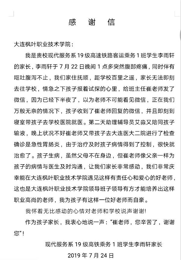 军训第五天,一封来自新生家长的感谢信让师生们再一次感受到师德的崇高和辅导员的伟大。
