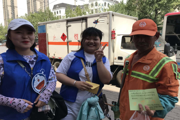 上午7时,志愿者们从学校出发,乘公交车前往活动地点——辛寨子街道。到达目的地后,志愿者们首先按照既定计划进行分工,一部分去到街道周边商户募集爱心物资,另一部分现场书写赠送给环卫工人们的感谢卡片。