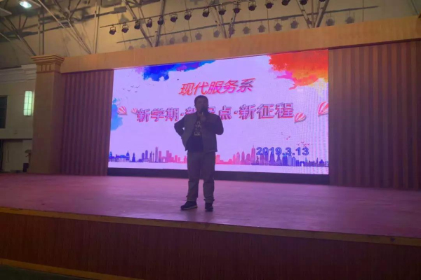 2019年3月13日晚18时40分现服务系在综合馆召开了《新学期·新起点·新梦想·新征程》的主题大会。出席的有现代服务系学生管理主任闫博、现代服务系学管教师孙庆好、现代服务系学管教师杨世平以及全体17级同学。