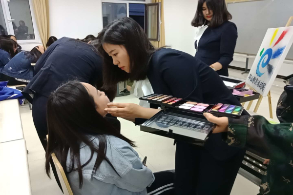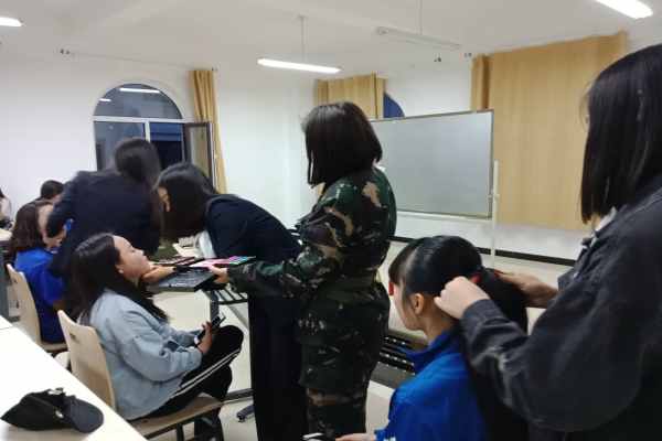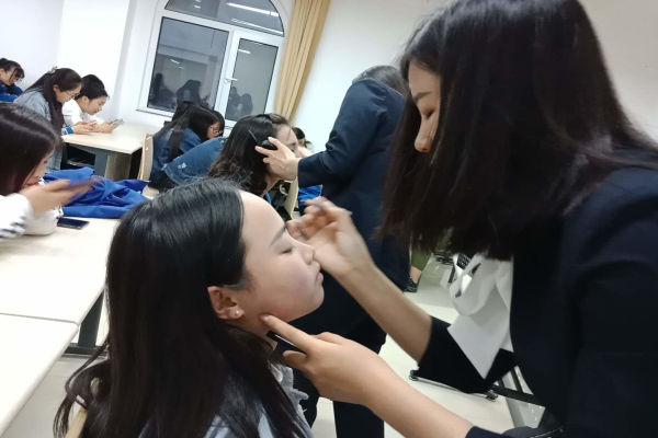 除了面部妆容外发型也很重要,长发的职业女性最常见的还是盘发造型,干净利落的造型给人强大的气场,发丝两侧梳理整洁,发顶带有优美的弧度,脑后的发丝盘成精美的发髻。也许你会在美丽和职业化妆两个标准之间摇摆挣扎,但是只要注意一些基本的原则,美丽和干练就可以兼得。干净整齐也是最重要的选择。同时我们教大家如何盘职业头,同学们学的也很认真,也相互找小伙伴练练手。