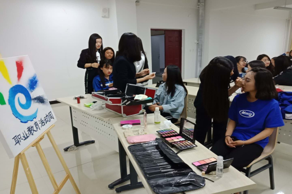大家积极参与职业礼仪和探讨职业化妆技能,在现场有几位同学自愿当模特示范,她们边化妆边讲什么样的脸型适合什么样的妆容,什么肤色适合什么口红等,交流气氛特别活跃,大家都积极表达自己的想法,成功的展示职业女性都是如何懂得如何打造自己的职业妆。