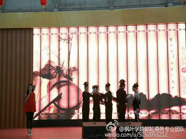 11月19日在首届校园外语节盛典上,国际邮轮乘务专业学生对中国传统文化及邮轮的工作生活进行了流利的英语展示,并以其完美的职业形象、独具创新的舞台表现形式,给现场师生留下了深刻的印象。