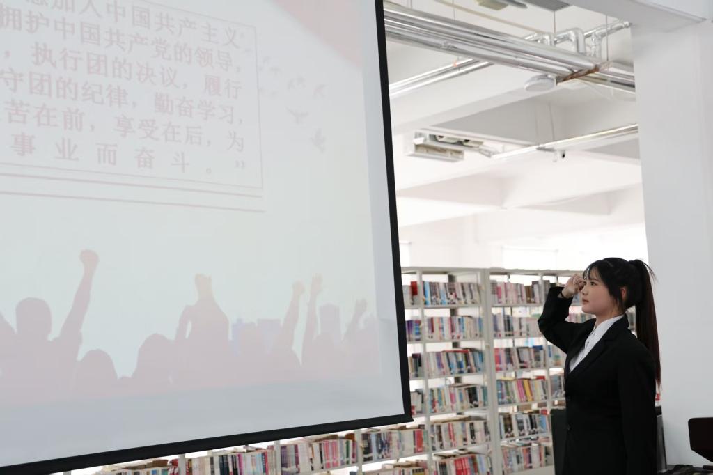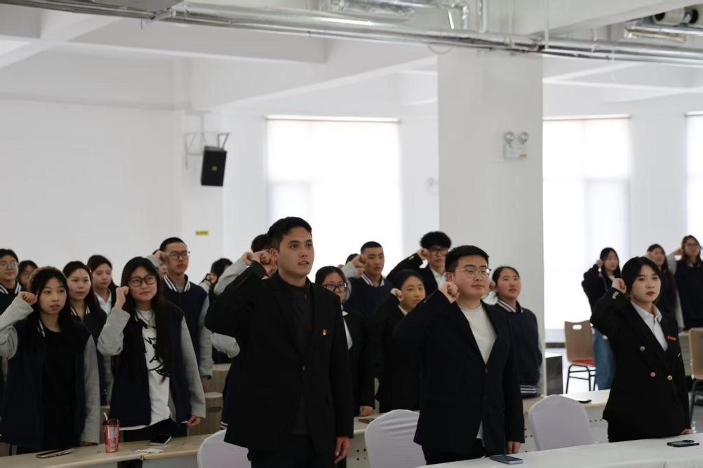 伴随团歌奏响,教师与老团员代表为新团员佩戴团徽,这份责任与荣光深深烙印心间。全体新团员面向团旗高举右拳,在领誓人带领下庄严宣誓,铿锵誓言回荡全场,饱含着青年们跟党走、矢志奋斗的决心。新团员代表激动发言,感恩团组织培养,并承诺严守团纪、深耕专业、践行担当,努力成为新时代好青年。老团员代表则结合自身经历,勉励新团员珍惜荣誉、奋勇争先,在青春赛道上奋力奔跑。