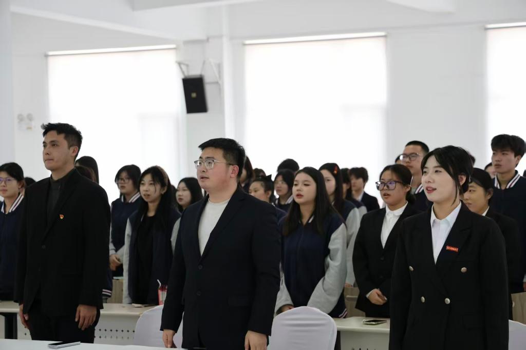 2026年3月25日,大连枫叶职业技术学院智慧城市服务产业学院隆重举行新团员入团仪式。学院团总支负责人刘宇轩、教师代表鲁星辰,及全体新团员、老团员代表齐聚一堂,共同见证102名青年学子迈入共青团的庄严时刻。仪式在雄壮的国歌声中启幕,全体人员肃立注目,尽显昂扬风貌。随后,团总支负责人宣读入团名单,102名新团员经层层考察,正式成为团组织新鲜血液。
