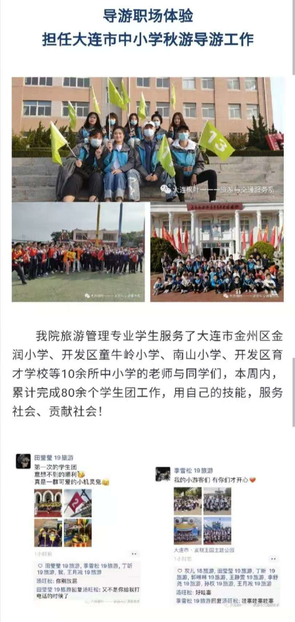 充分利用校企合作平台,与大连浪漫假期国际旅行社合作,聘请企业经理人为我院旅游管理专业学生进行导游带团的岗前培训,培训后企业排团,学生担任大连市各中小学秋游活动导游,独立完成上岗带团。