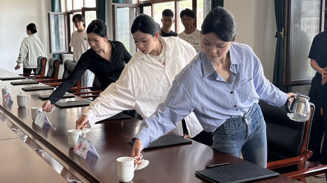 在茶艺培训环节,专业老师悉心指导礼仪团成员。从茶叶的类别区分,如绿茶的清新淡雅、红茶的醇厚浓郁、乌龙茶的香气高长等,到泡茶器具的认识,包括茶壶、茶杯、茶盘、茶则等,再到详细的泡茶流程,如温杯、投茶、注水、出汤等步骤,每一个细节都讲解得十分透彻。成员们在实践操作中不断练习,力求精准掌握每一个动作,感受茶艺所蕴含的深厚文化底蕴,体会其中所传达的宁静、和谐与尊重。