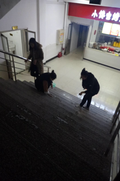 由部长带领会员们去活动地点,首先派发清扫工具,然后开始分组去个个清扫地点,热火朝天的劳动现场,充分展现了志愿者阳光向上、精神饱满的良好状态。志愿者们仔细清理着楼梯上面的口香糖渍,天气虽然寒冷但阻挡不了大家的热情,清理完口香糖渍后,由两位男生清理地面上的水渍。