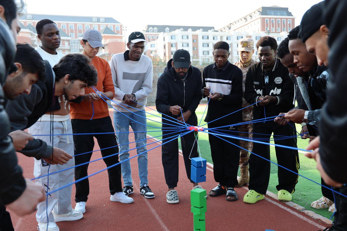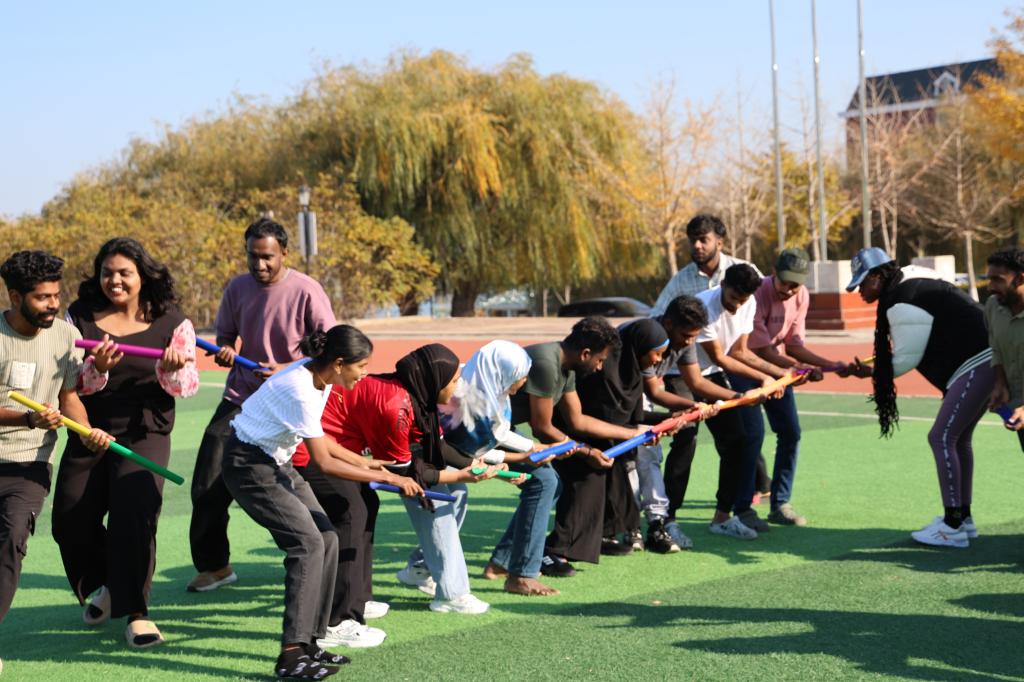 深秋的大连,微风拂面,阳光和煦。上午九时许,留学生们便已精神抖擞地集结在操场上。在专业拓展教练的指导下,大家迅速分组,投入到拓展项目中。“合力筑塔”、“珠行万里”、“一圈到底”等一系列趣味性与协作性兼具的游戏,迅速点燃了留学生们的热情。操场上,不同肤色的面孔洋溢着同样的笑容,大家为了共同的目标出谋划策、默契配合,加油声、呐喊声、欢笑声此起彼伏,汇成了一曲青春与友谊的交响乐。