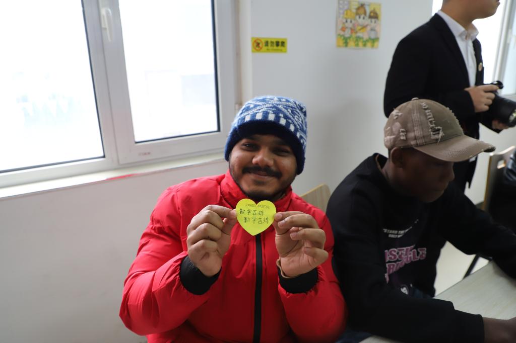 互动环节将活动推向高潮。传统翻花绳游戏让中外学生在指尖技艺中感受东方智慧,心愿树许愿墙前,留学生们用母语写下留学憧憬,用汉字书写"勤学苦练"的初心誓言。最后的全家福拍摄定格了这个充满温情的时刻。